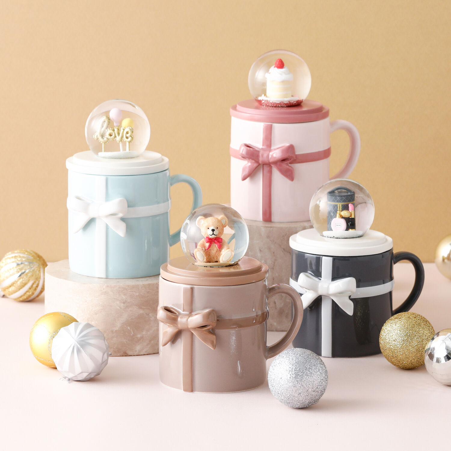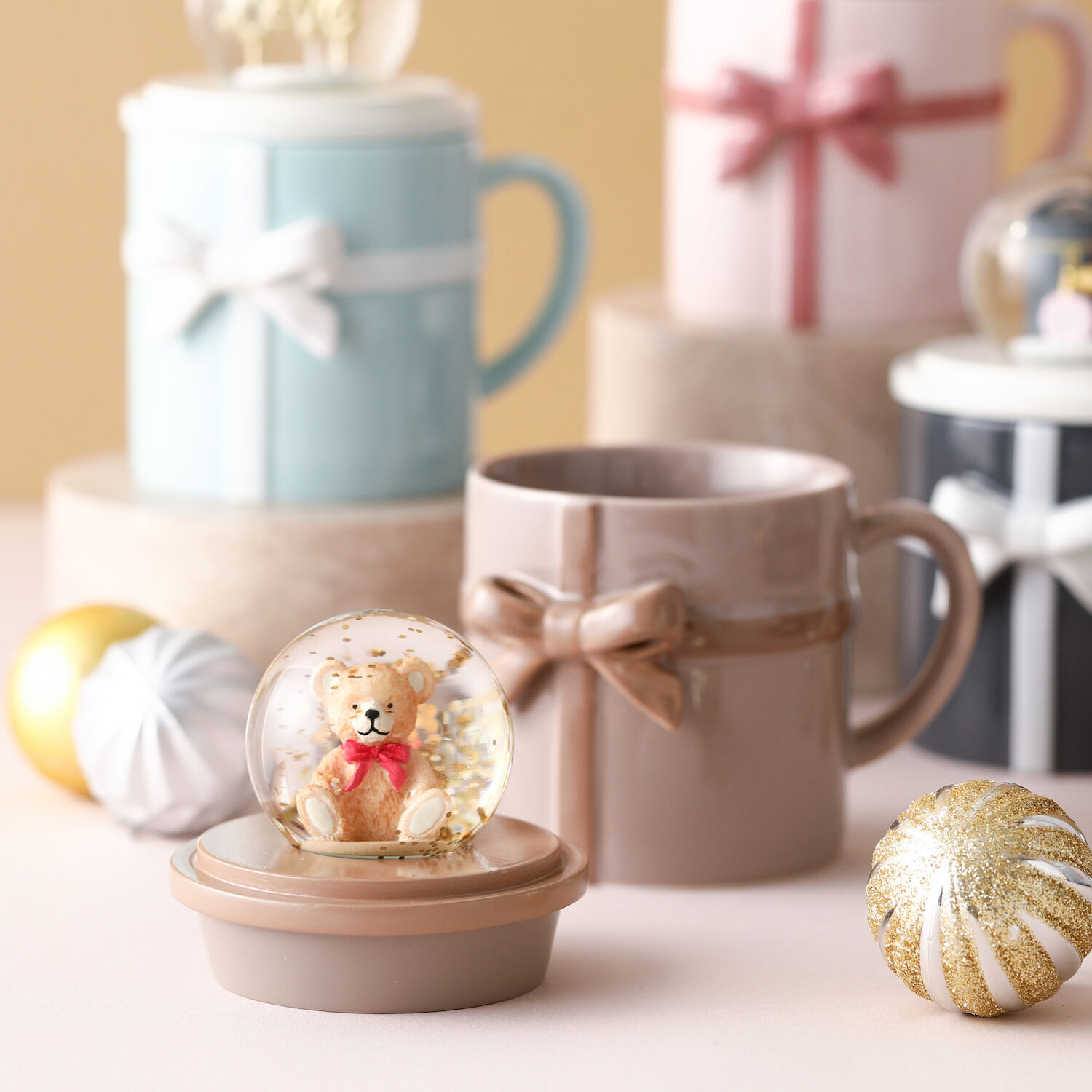 マグカップを使わない時はスノードームとしてそのままお部屋に飾ることができます。ギフトにぴったりなマグのキュートなリボンもポイントです。