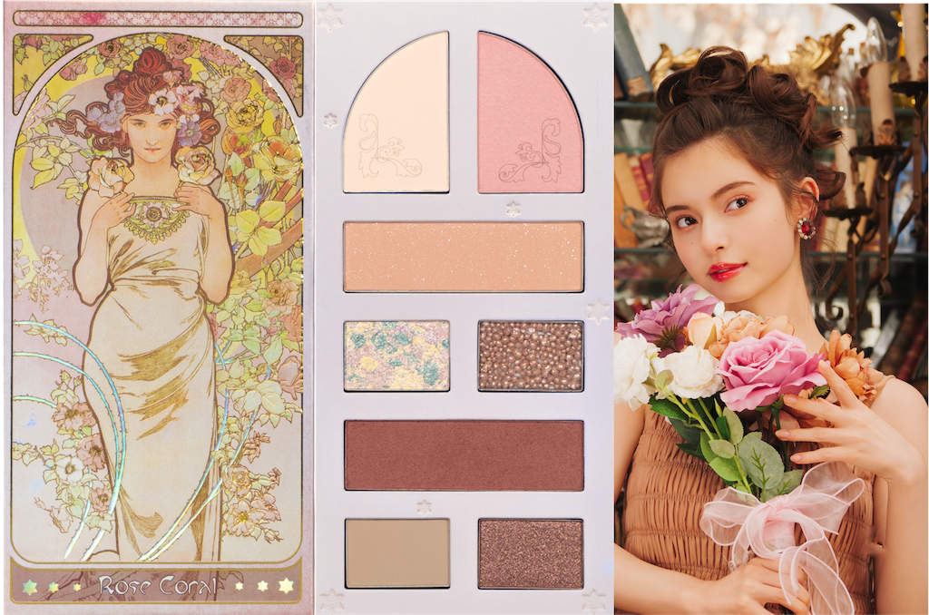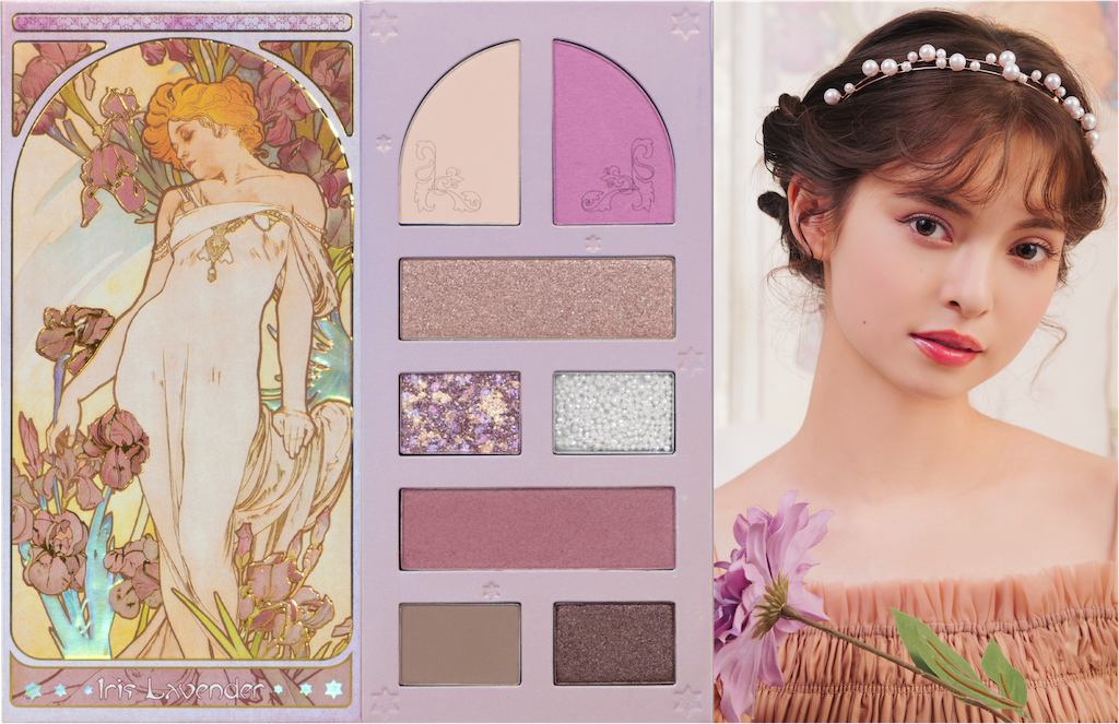 レディフラワーパレットにはアルフォンス・ミュシャの連作「四つの花」から、「ユリ」「バラ」「アイリス」の3作品が採用されています。これはアイシャドウ、チーク、ハイライトが入ったパレットですが、用途を問わずマルチユースできる使用感だそう。チークカラーを目元に乗せたり、ラメアイシャドウをハイライトとして使用したりと自由なメイクが楽しめますね。