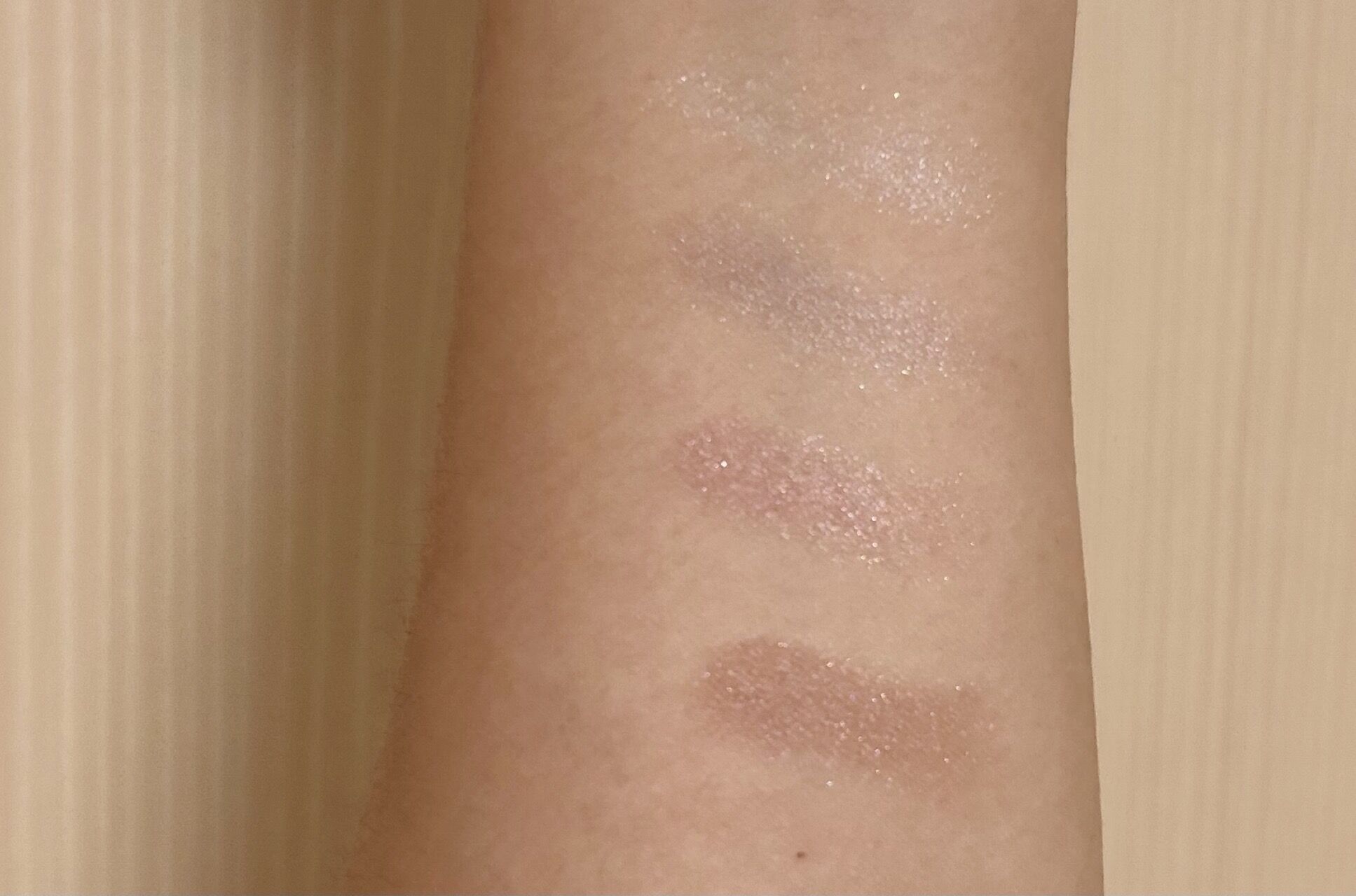 こちらは「EX01 ライラックデュウ」です。やわらかなラベンダーのカラーが頬に澄んだ透明感をプラス。実際に肌にのばしてみると、なめらかにフィットするのがわかります。弾力とソフトフォーカス効果のあるジェル成分が配合され、毛穴などの凹凸を目立たせずに肌をなめらかに見せてくれます。