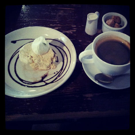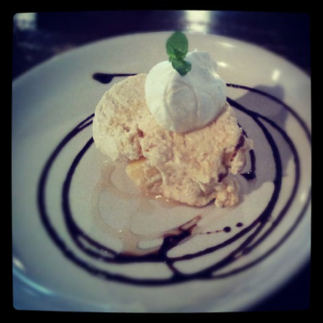 下に円を描いたほろ苦いキャラメルソースに、甘いクリームチーズとの相性が抜群にいいんだわ。おすすめ。