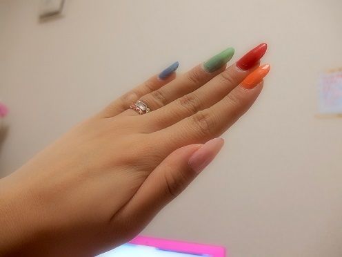 二度塗りするとこんな感じ。マットな「マーズ(レッド)」と「ヴィーナス(オレンジ)」はしっかり発色がよく、「ムーン(ピンク)」、「マーキュリー(ブルー)」そして「ジュピター(グリーン)」はパールが入っています。それぞれ、流行を取り入れたり、日本人の肌に合いやすいものが選ばれているということ。確かに、グリーンやブルーという普段あまり選ばないカラーも、パールの入った淡い仕上がりなので落ち着いた印象にみえますね。