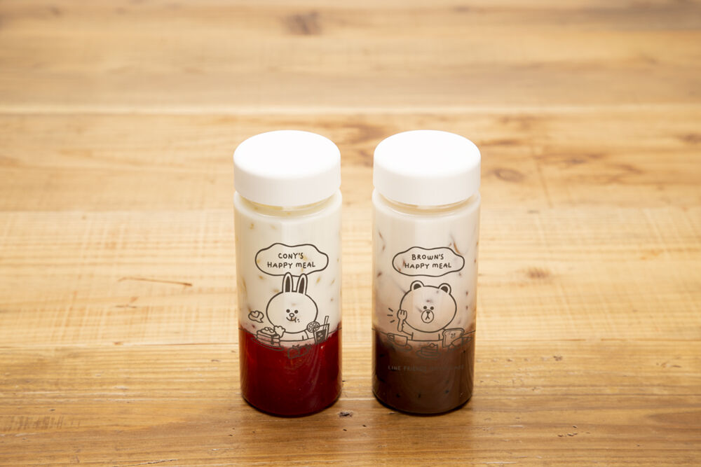 チョコレートラテにマカロンになったブラウンをトッピング。ストロベリーラテにはマカロンになったコニーがトッピングされています。